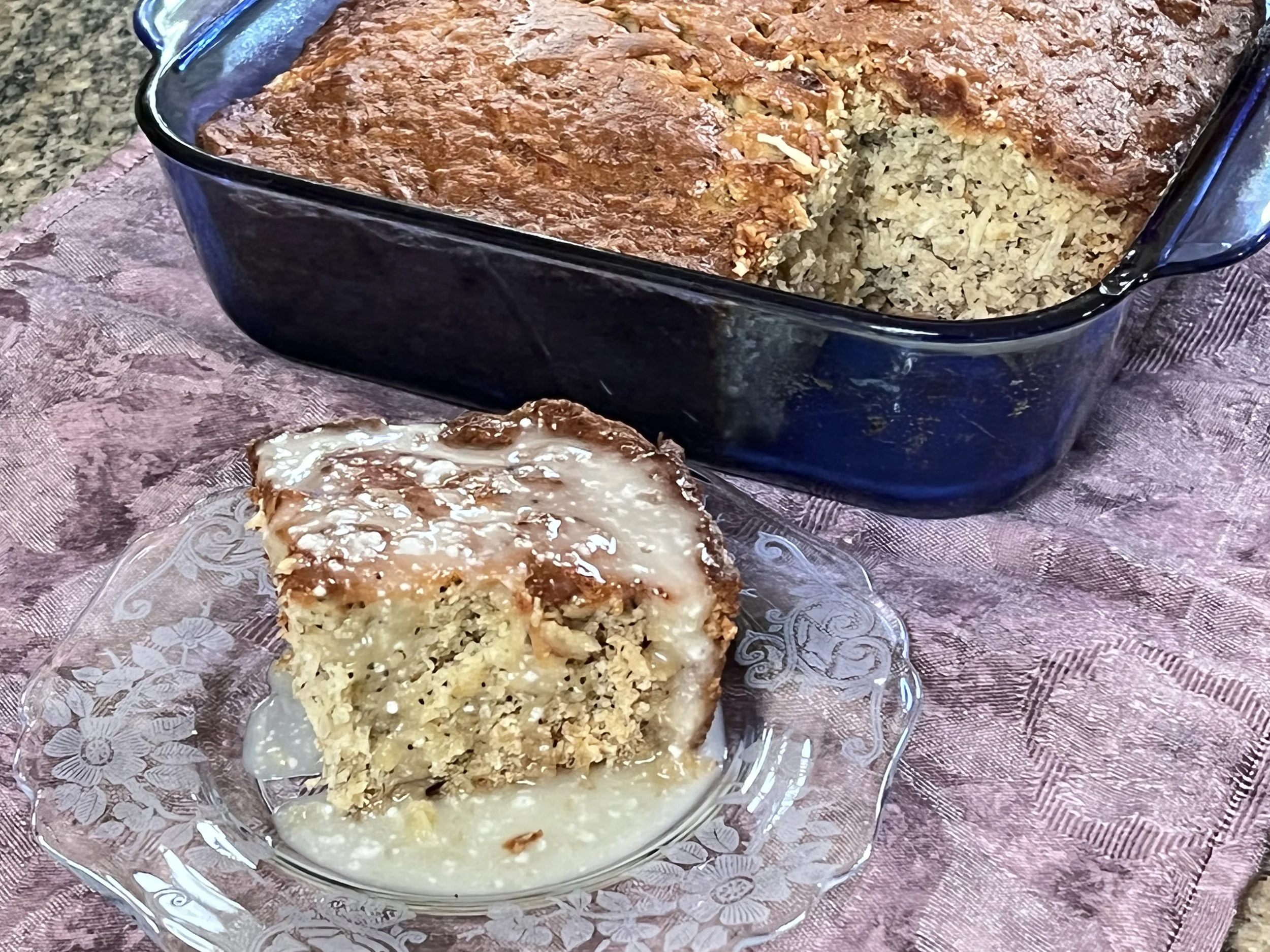 Delicious pineapple banana snack cake with coconut and poppy seeds have a pineapple glaze drizzled on top. Inspired by Sue Moran at The View from Great Island https://theviewfromgreatisland.com/pineapple-banana-bread/#recipe