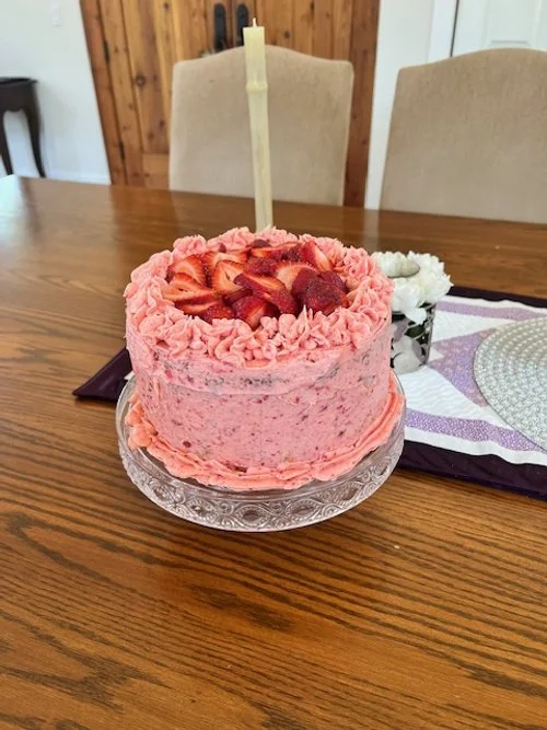 Place one layer of cake and place on a cake plate or serving board. Spread with a generous layer of frosting, adding ½ cup of sliced strawberries on top in a single layer. Place the second cake layer on top and spread with a generous layer of frosting on top and around the sides. Pipe a ruffle around the top layer if desired, and decorate with the remaining sliced strawberries.