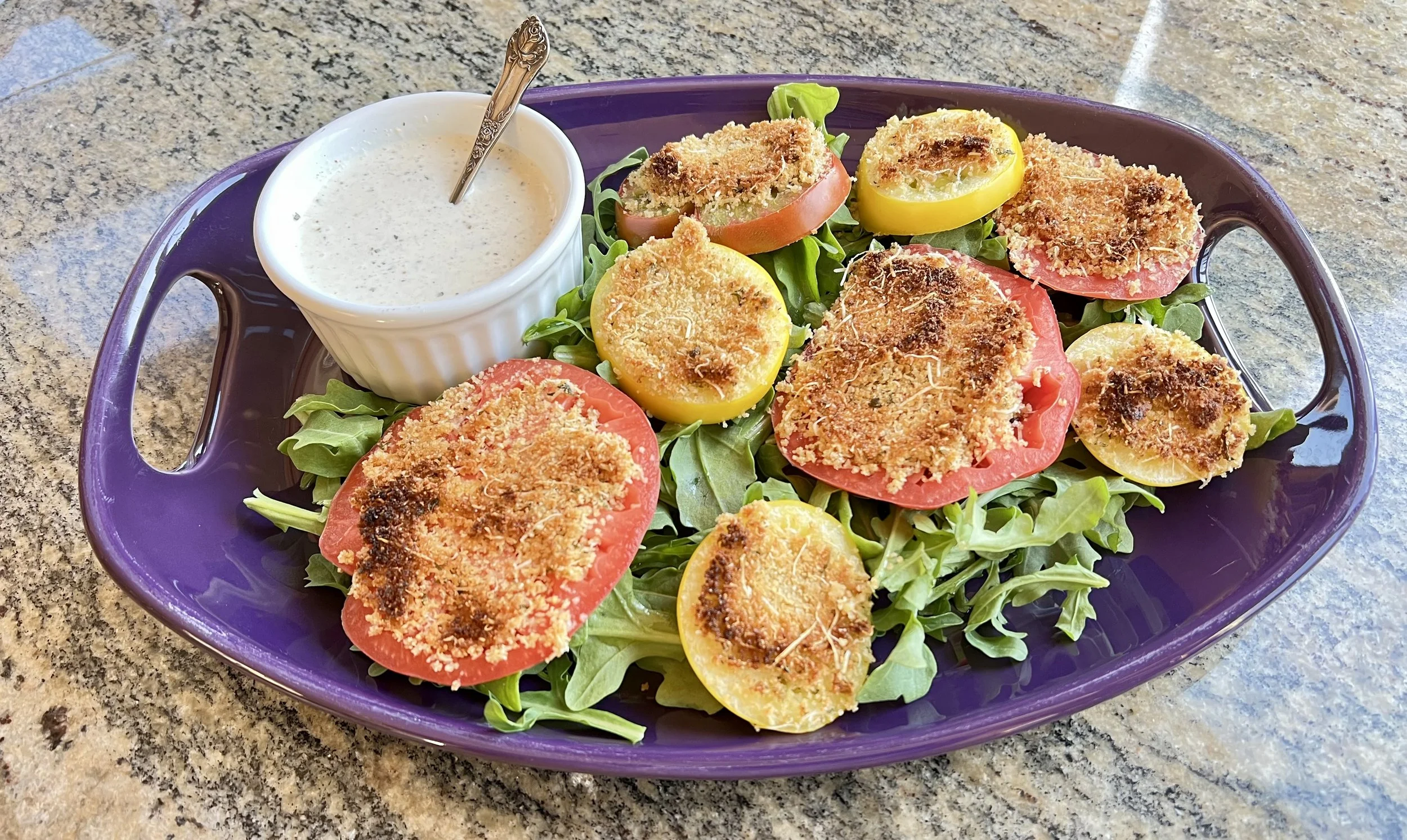 Beautiful tomatoes baked with a crisped parmesan cheese breadcrumb and served with a zesty horseradish cream sauce. Such a quick and easy recipe! Inspired by the beautiful summer tomatoes and in different colors too; as well as my friend Marcia who passed some vintage recipe books down to me. Betty Crocker 30 Minutes or Less, July 1991.