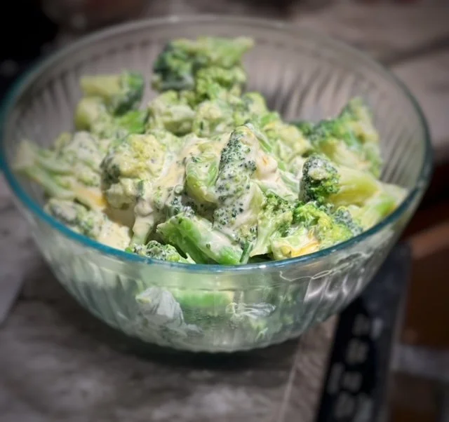 Broccoli steamed al dente or to your taste with a creamy cheddar sauce and green onions. My friend Cheryl does something similar and it’s always a HIT!!!