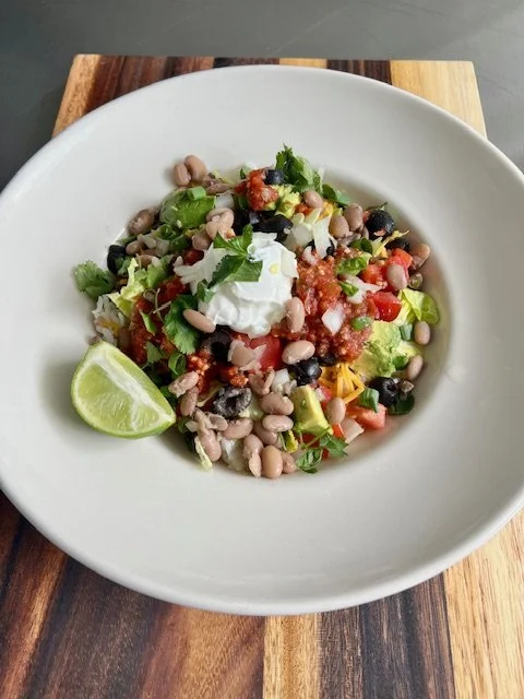 Chipotle bowls with rice, pinto beans, chicken, corn, and all your favorite Mexi toppings. My favorite pinto bean recipe is linked below, but you can certainly use canned pintos or black beans.