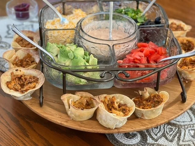 Preheat oven to 400*. Warm tortillas between dampened paper towels on a plate in the microwave for about 2 minutes or warm on a griddle with olive oil spray, cooking about 1 minute a side until the tortilla will bend without tearing. Place a tortilla in the muffin tin wells and add a couple tablespoons of the chicken bean mixture in each tortilla. Bake for 10-12 minutes, the edges will brown and the chicken mixture will be hot. Serve with toppings buffet style.