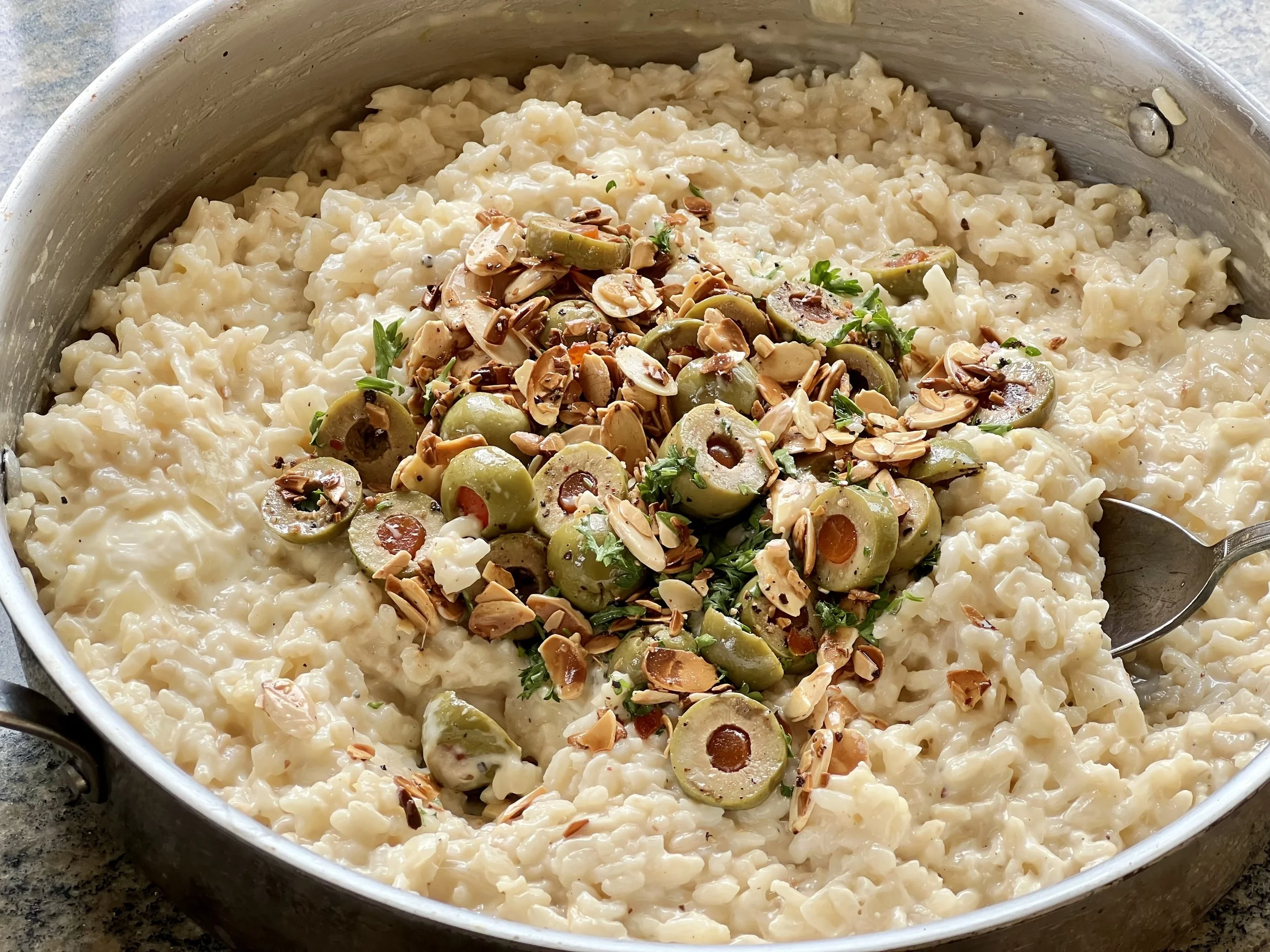 Green Olive Crescenza Cheese Risotto with Fried Almonds