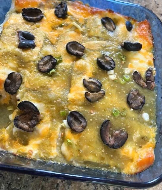Spray oil a griddle or large skillet over moderate heat and cook the tortillas for approximately 1 minute per side, making them malleable so they don’t crack when you're rolling them. Stack them on a plate to keep them warm. Spread a generous spoonful of the beef filling into the tortillas and roll them up, place them seam side down in the sauce. Smother them with more green enchilada sauce. Top with black olives and another ½ cup of Mexican cheese. Bake until warmed through, about 20-30 minutes. Remove from the oven and top with green onions, guacamole, and sour cream for serving.