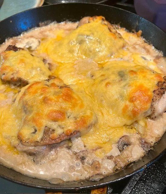 Chicken braised in a mushroom sour cream sauce, topped with cheddar cheese, is the ultimate comfort food. Inspired by Janelle at a Dish of Daily Life https://www.adishofdailylife.com/smothered-cheesy-sour-cream-chicken/