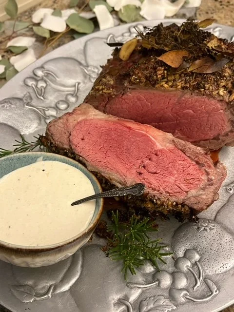 Prime rib roast with a bay and garlic crust and a shiitake mushroom red wine mushroom au jus. Just right for mashed potatoes and your favorite celebrations. Medium-rare should cook for about 13 minutes per pound. Use a meat thermometer for insurance.