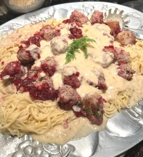 Delicious Swedish meatballs with lingonberries over pasta with cream sauce. Inspired by Lori Lange at https://www.recipegirl.com/swedish-meatballs/ and by Nigella Lawson with her traditional way of serving with lingonberries.