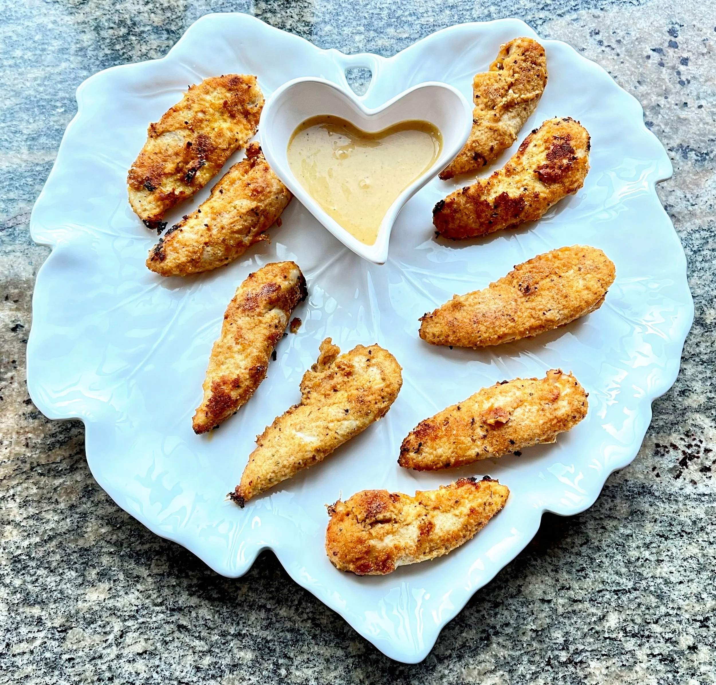 Oven-fried chicken tenders are soaked in milk which makes them very tender, and then baked with butter in a panko crust.