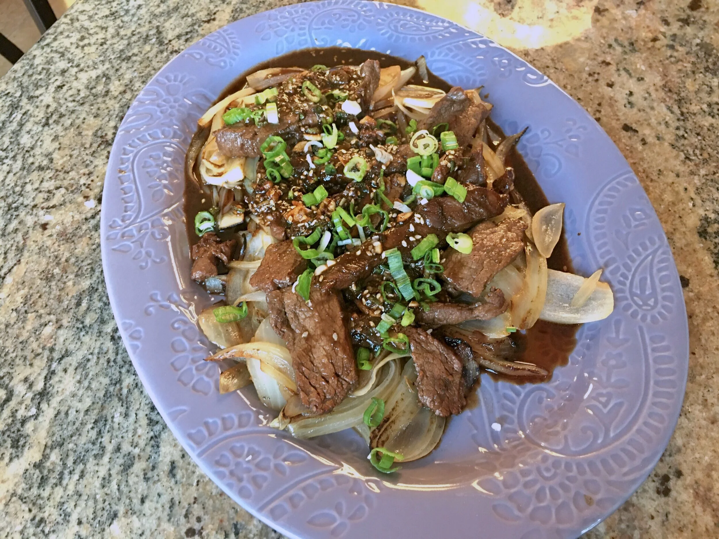 Marinated strips of flank steak sauteed over caramelized onions with a green onion mildly spicy teriyaki sauce.