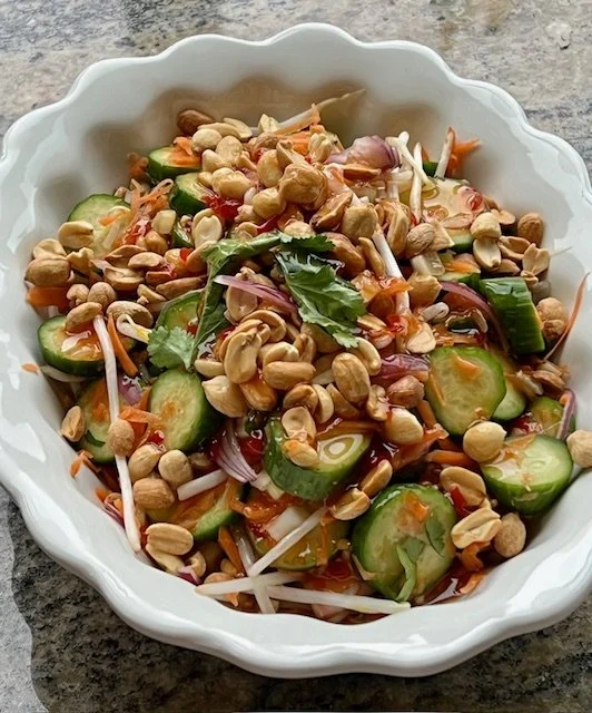 Delicious crunchy cucumber salad with cilantro, red onion, and peanuts. Drizzled with a dressing of sweet chili sauce and apple cider vinegar. Inspired by Bee Yinn Low at rasamalaysia https://rasamalaysia.com/thai-cucumber-salad/