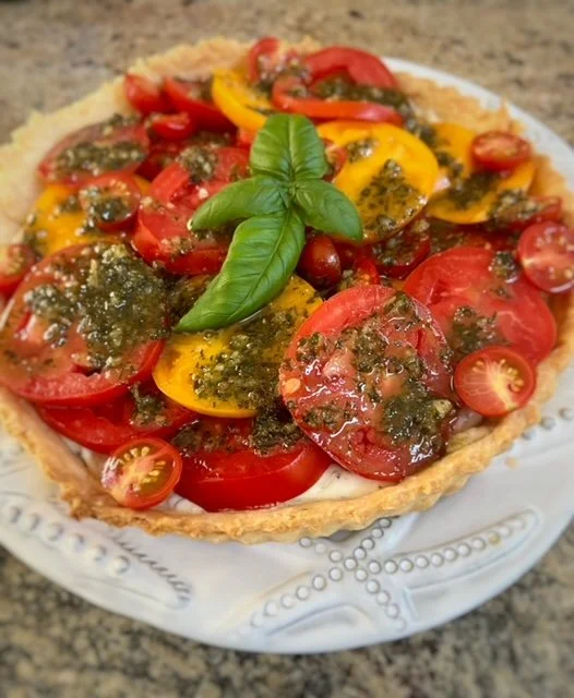 Fresh summer tomatoes set in a goat cheese cream encased by a herby flaky tart crust and drizzled with a pesto vinaigrette. Inspired by David Leite of Leite’s Culinaria https://leitesculinaria.com/1692/recipes-fresh-tomato-tart.html
