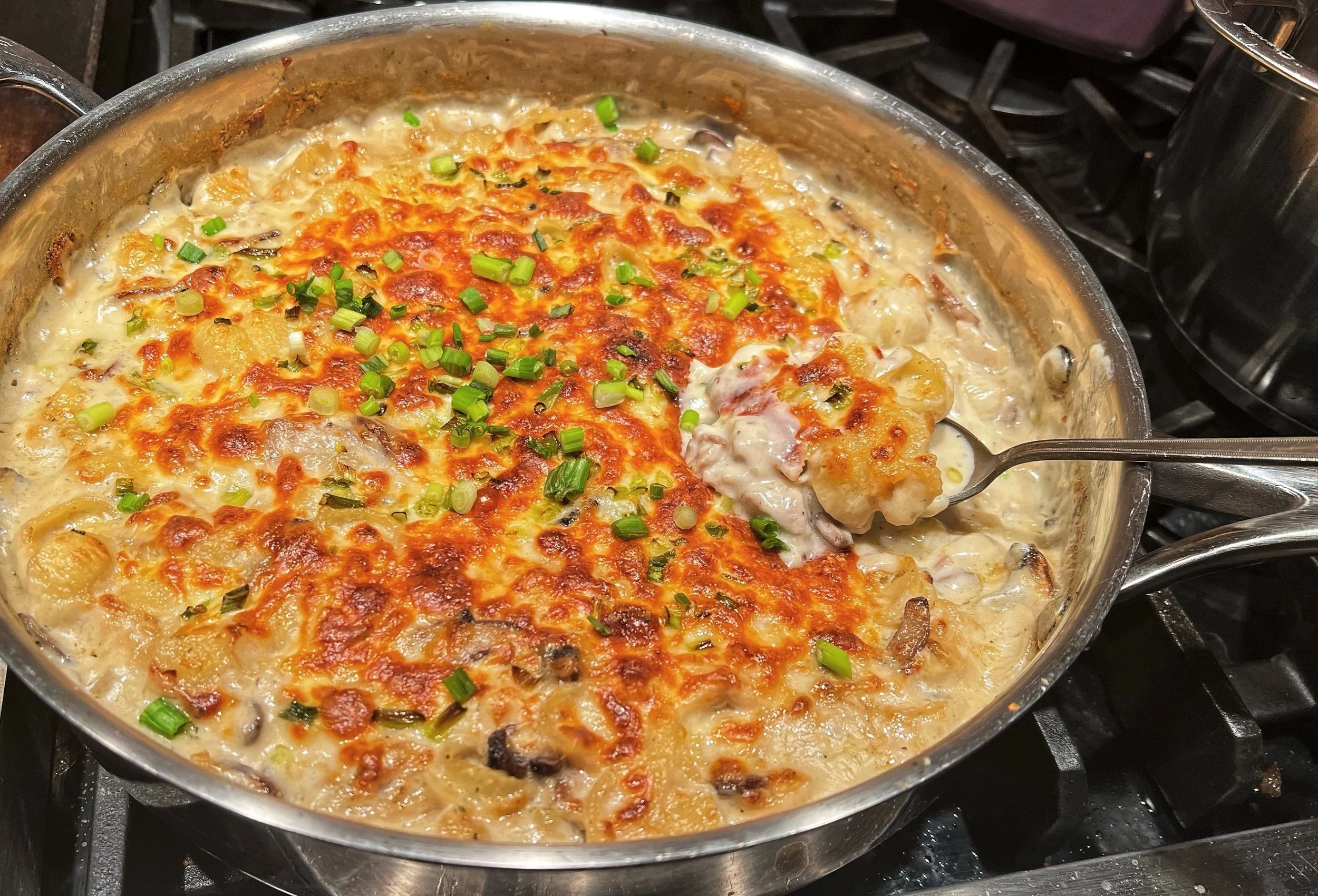 Creamy cheesy turkey with mushrooms and shell pasta with a broiled cheese lid. This dish is the perfect way to use up leftover turkey after the big day in a way that makes turkey seem totally fresh and new. Inspired by Holly Nilsson of Spend with Pennies https://www.spendwithpennies.com/turkey-tetrazzini/