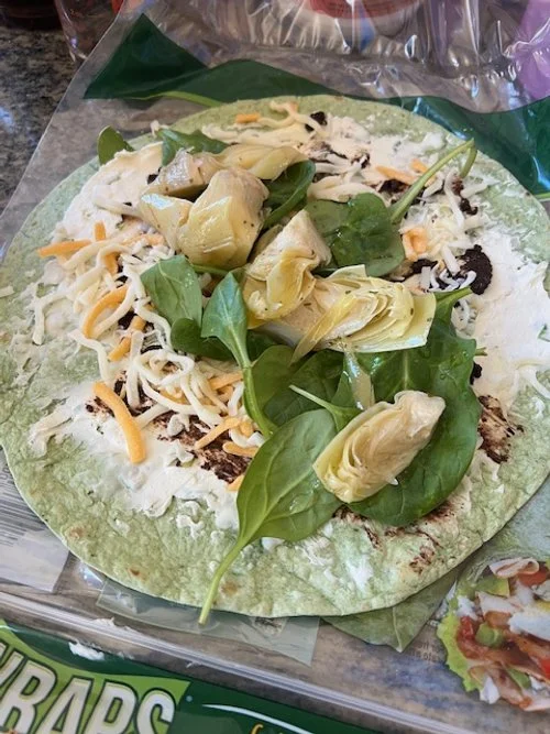 Place a wrap on top of a layer of plastic wrap. Mix the cream cheese, green onions, and onion salt together in a mixing bowl. Spread a generous amount of the cream cheese mixture over the wrap and place a mound of spinach in a straight line that runs through the middle, top the mound with a few artichoke hearts. Sprinkle the shredded cheese randomly all over. Fold the wrap over the mound and roll as tightly as you can, then wrap it in the plastic wrap. Place in the fridge overnight, or several hours before serving. When ready to serve, slice into pinwheels and place on a platter.